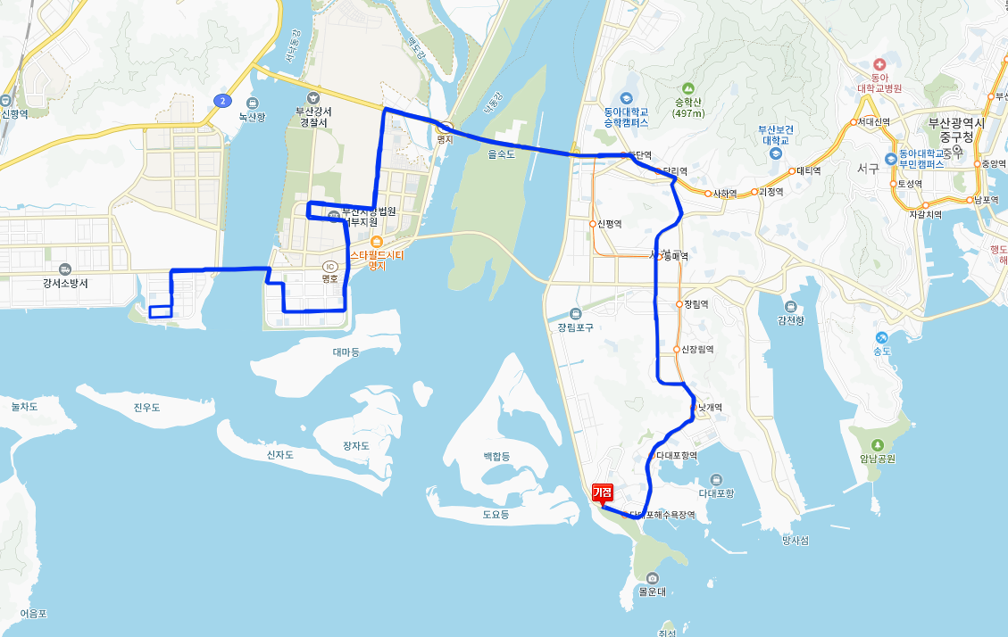 다대포 - 다대포해수욕장역 - 다대포해수욕장 - 다대자유아파트 - 다대우신아파트 - 다대포항역 - 다대1동주민센터 - 다대푸르지오아파트 - 다대현대아파트 - 낫개역 - 다대롯데캐슬블루 - 성보냉장 - 동원자동차정비공업사 - 벽산아파트 - 협성르네상스타운아파트 - 효림초등학교 - 장림우체국 - 빙그레서부산영업소 - 기동대입구교차로 - 동매역 - 신평 - 배고개 - 동매교사거리 - 사하구청.당리역 - 낙동초등학교 - 하단역환승센터 - 을숙도문화회관 - 부산현대미술관 - 진목 - 경일고등학교입구 - 경일고등학교후문 - 스위트팰리스 - 협성휴포레 - 호반베르디움2차.금강펜테리움2차 - 금강펜터리움1차 - 중흥프라디움 - 한국토지주택공사 - 법원검찰청후문 - 더샵퍼스트월드 - 지법서부지원.지검서부지청 - 법원검찰청사거리 - 명지환승센터 - 명원초등학교 - 행복마을 - 엘크루블루오션4단지 - 롯데캐슬아파트 - 극동스타클래스 - 두산위브 - 명호초등학교 - 퀸덤1.2단지 - 신호대교 - 르노자동차남문 - 윌아파트 - 신호농협